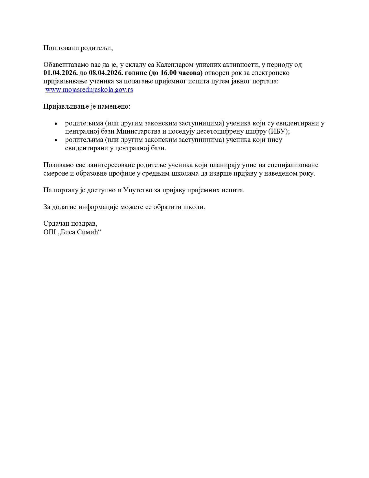 ПРИЈАВЉИВАЊЕ ЗА ПОЛАГАЊЕ ПРИЈЕМНОГ ИСПИТАДатум: 02. April 2026 13:38 Категорија: Новости